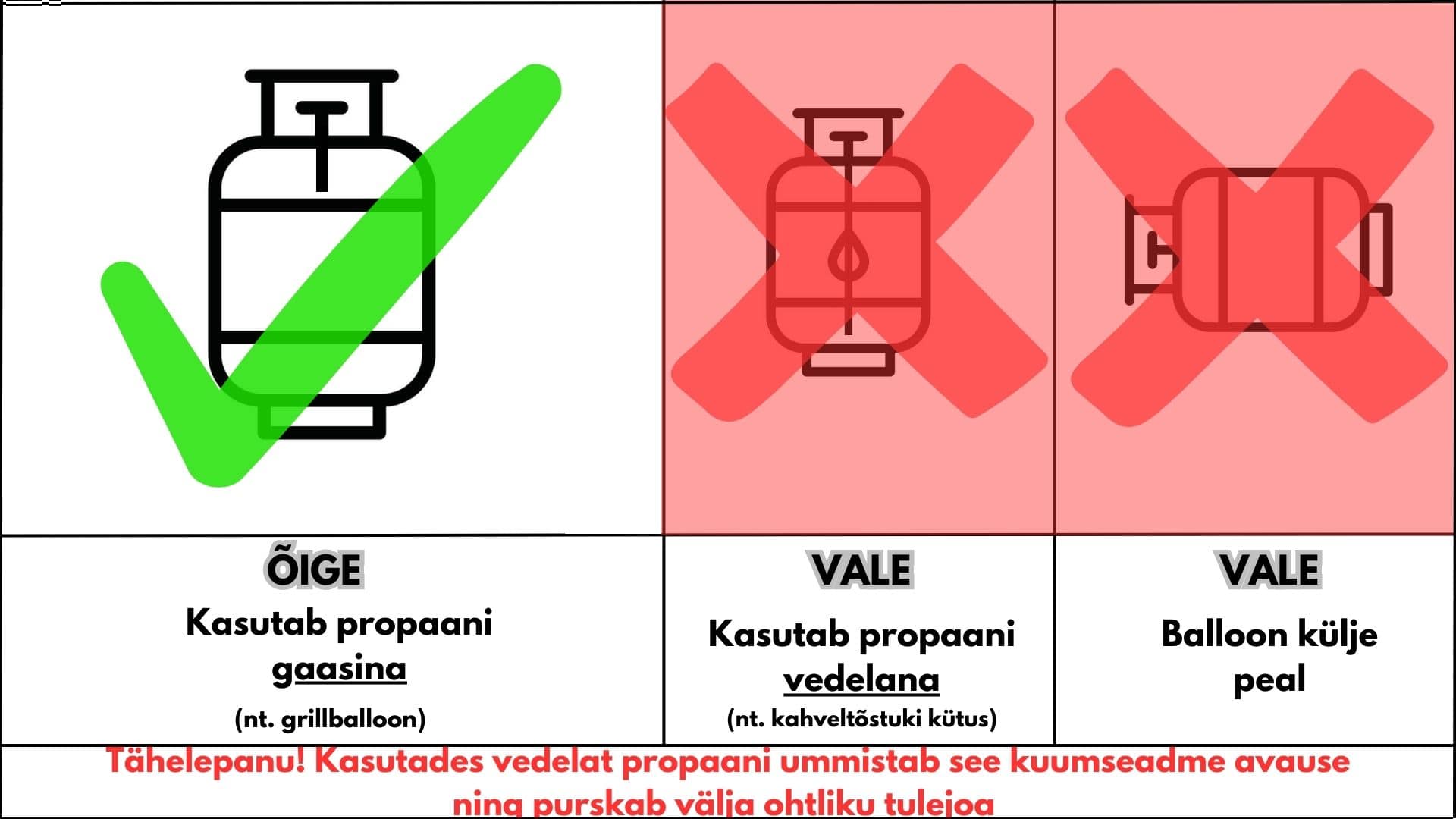 - Enne kuumseadme kasutamist kontrolli kõiki osi, et veenduda nende korralikus töös ja komponentide (sh voolik, regulaator ja kuumseade ise) kahjustuste puudumises.